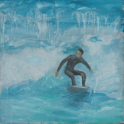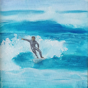 Kleines Ölbild zeigt aufgewühltes Meer mit schwimmendem Surfer
